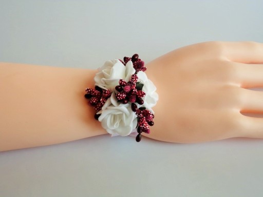 Na rękę wiązany jest za pomocą białej satynowej tasiemki o szerokości 25mm i długości ok. 40cm.