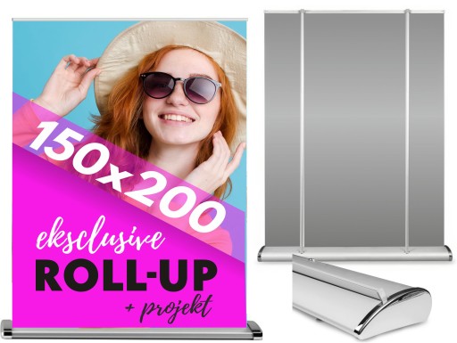 Roll-up składa się z aluminiowej kasety i stelaża z zamocowaną grafiką. Wersja Exclusive posiada ciężka i elegancką kasetę bez nóżek, grubą tyczkę, oraz chromowane boki.