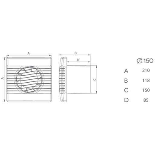 - Wymiary: A- 210, B- 118, C- 150, D- 85 mm,