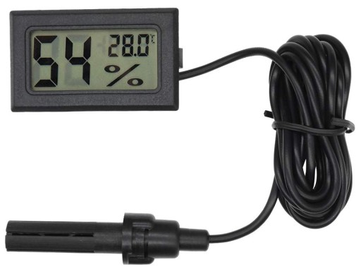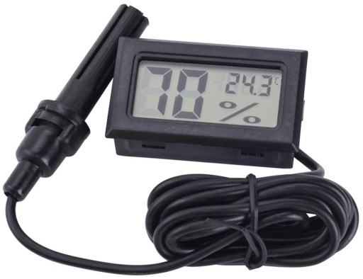 Elektroniczny higrometr z termometrem z dużym wyświetlaczem LCD i sondą (czujnikiem) pomiarową z przewodem o długości 150 cm. Urządzenie charakteryzuje się dobrą rozdzielczością pomiaru i szybkością reakcji. Wystarczy położyć je na otwartej dłoni i niemal od razu widać reakcję przyrządu.