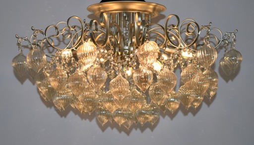 Lampę zdobią szklane banieczki oraz kryształowe łańcuszki w kolorze miodowym