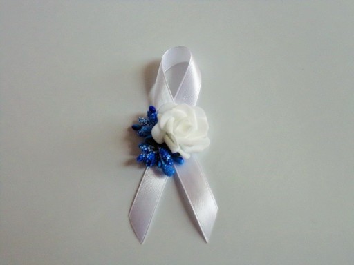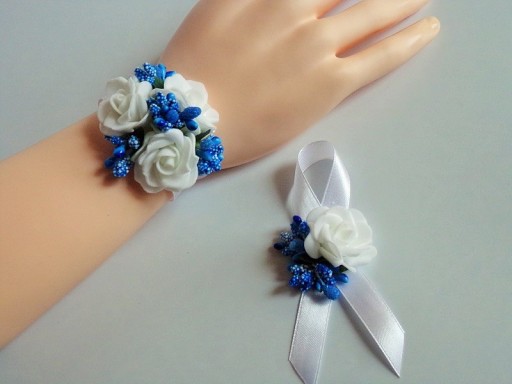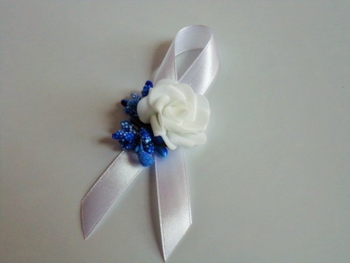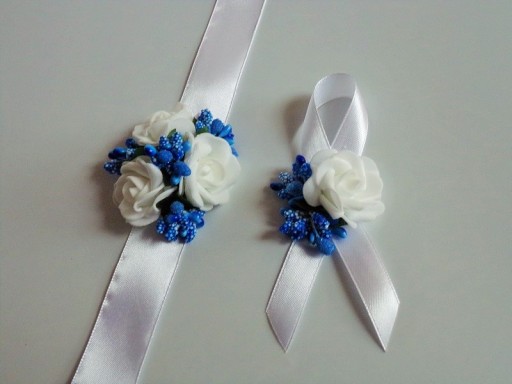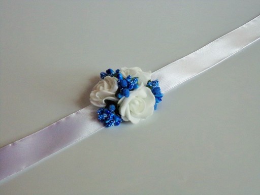 Na rękę wiązany jest za pomocą białej satynowej tasiemki o szerokości 25mm i długości ok. 40cm.