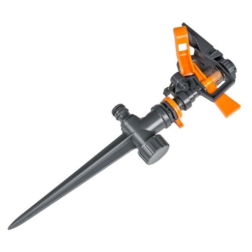 Zraszacz pulsacyjny wbijany z wysokiej jakości tworzywa na przelotowym plastikowym kolcu. Regulowana wielkość i kształt pola zraszania. Blokada dla spryskiwania wybranego sektora. Kolec posiada nypel do szybkozłączy i możliwość szeregowego połączenia z innymi zraszaczami. Obszar zraszania 24m.