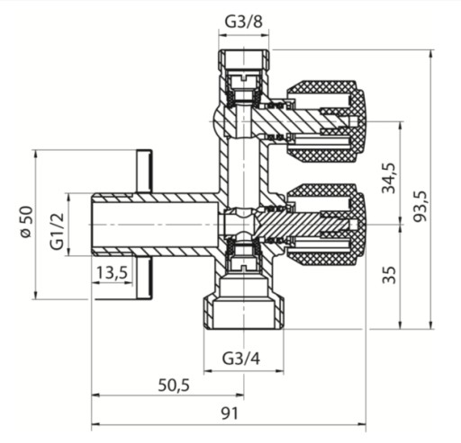 Кран шаровой угловой EKO DUO 1/2"-3/4"-3/8" VALVEX