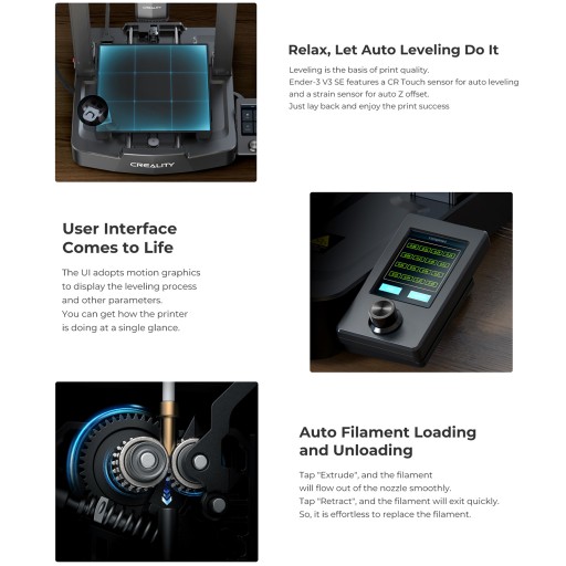 Platforma drukująca z automatycznym poziomowaniem: Ender-3 V3 SE jest wyposażony w czujnik CR Touch do automatycznego poziomowania i czujnik naprężenia do automatycznego przesunięcia w osi Z. Po prostu połóż się wygodnie i ciesz się sukcesem drukowania. I zastosuj łóżko grzewcze ze stali sprężynowej PC, które szybko się nagrzewa i łatwo zdejmuje model.