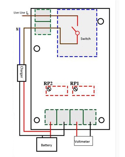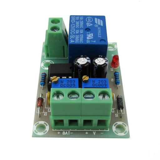 Moduł ten pozwala na automatyczne sterowanie ładowarką. Podczas gdy napięcie w akumulatorze spadnie poniżej ustawionej wartości to moduł uruchomi ładowarkę. Gdy akumulator będzie naładowany (do ustalonego napięcia) to wyłączy ją, zabezpieczając tym samym akumulator przed przeładowaniem.