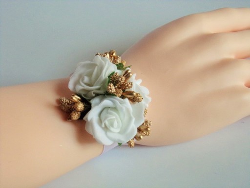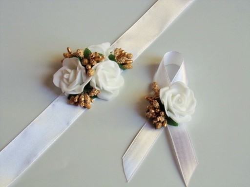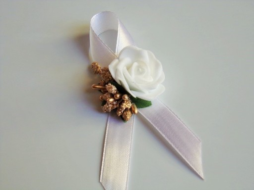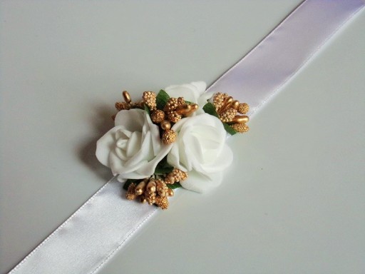 Na rękę wiązany jest za pomocą białej satynowej tasiemki o szerokości 25mm i długości ok. 40cm.