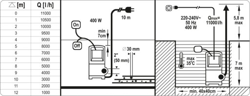 - bardzo dobra wydajność: przepływ dla pompy 400 W = 11 m3/h (wraz z wysokością podnoszenia jak w każdej pompie spada wydajność przepływu)