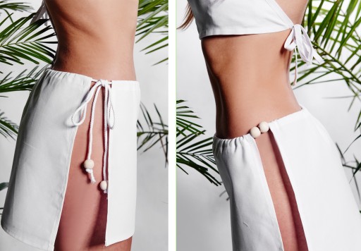 Zdjęcia stroju na saunę Bambea w kolorze białym na przykładowej modelce wyłącznie poglądowe. Spódniczka i woreczek jest bez widocznych logotypów.