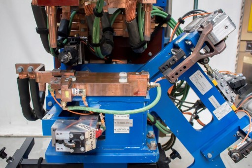 Zgrzewarka posiada 3 elektrody, zestaw uchwytów, czujnik, hak, które pracowały przy produkcji blach samochodowych firmy SAAB.