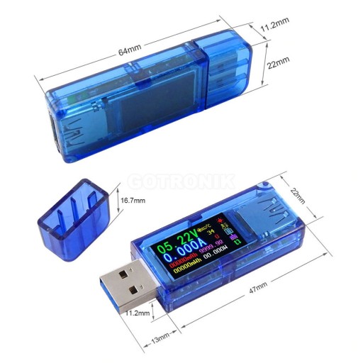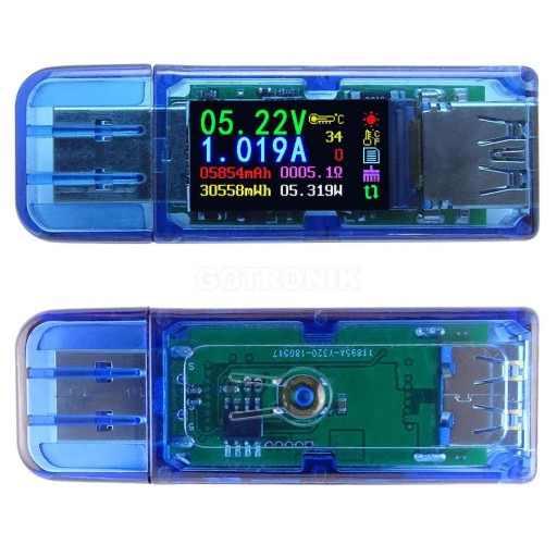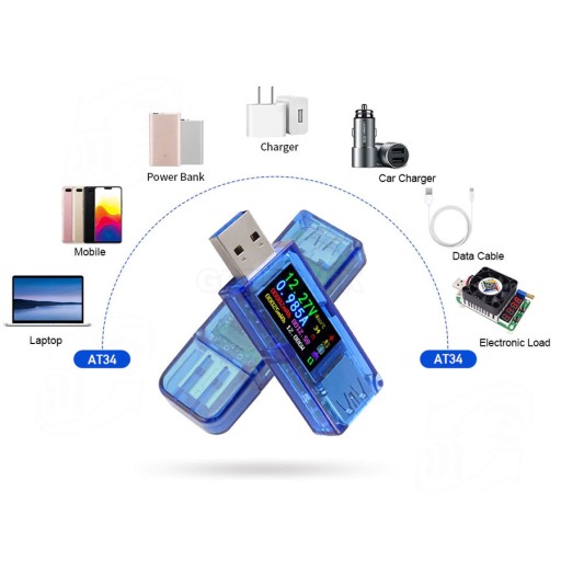Miernik AT34 produkcji RD przeznaczony jest do wykonywania pomiarów parametrów elektrycznych na porcie USB 3.0 i wcześniejszych wersjach. Mierząc jednocześnie napięcie i prąd obliczane są na tej podstawie inne parametry elektryczne: moc, rezystancję (impedancję obciążenia), pojemność ładowanego akumulatora, pomiar zużytej energii elektrycznej itp. Wyniki pomiarowe prezentowane dużym kolorowym wyświetlaczu LCD o przekątnej 0,96 cala. Wszystkie najważniejsze mierzone parametry elektryczne wyświetlane są w różnych kolorach co znacznie ułatwia obserwację wyników. Wyświetlacz posiada duży kontrast, oraz funkcję wygaszacza. Przy pomocy przycisku sterującego możemy przełączać się pomiędzy dwoma wariantami ekranu wyświetlania danych pomiarowych. Istnieje także możliwość programowego obracania wyświetlanego obrazu o 180 stopni. Dodatkowo miernik AT34 mierzy: temperaturę otoczenia - wbudowany termometr, napięcie na liniach różnicowych D+/D-, wykrywa tryby szybkiego ładowania. Biorąc pod uwagę szerokie zakresy pomiaru napięcia do 30,00V i prądu do 4,000A tester AT34 można wykorzystać także jako miernik elektryczny nie tylko do urządzeń komputerowych USB zasilanych napięciem 5V.