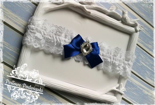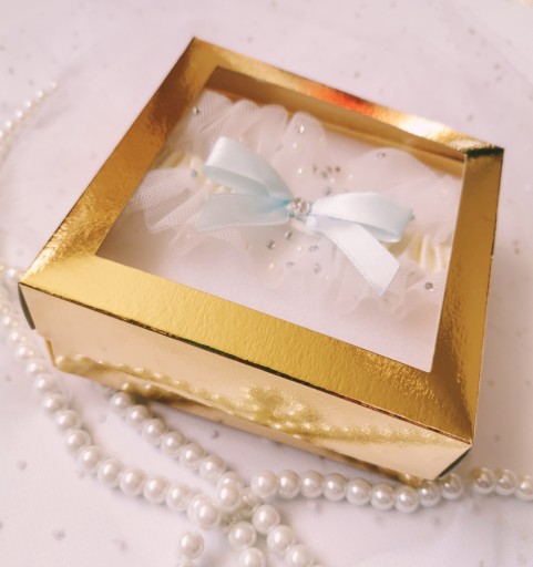 Podwiązka zapakowana w pudełko białe kokarda na pudełku dopasowana do koloru kokardy na podwiązce