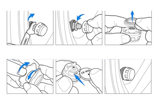 Czujniki ciśnienia posiadają wymienną baterię CR1632. Po wyczerpaniu należy wymienić baterię. W zestawie znajduje się specjalna nakrętka, która pozwala na otwarcie czujnika i wymianę baterii.