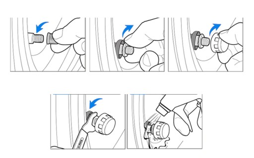 Montaż czujników z zestawu jest bardzo prosty i szybki. Odkręcamy stare nakrętki na wentyle. Następnie nakręcamy antykradzieżowe nakrętki a po nich czujniki wg oznaczenia czujników: LF (Left Front) lewe przednie koło, LR (Left Rear) tylne lewe koło, RF (Right Front) prawe przednie koło, RR (Right Rear) tylne prawe koło. Dokręcamy ręcznie nakrętkę antykradzieżową jak najbliżej czujnika, którą następnie dociągamy za pomocą klucza dołączonego do zestawu.