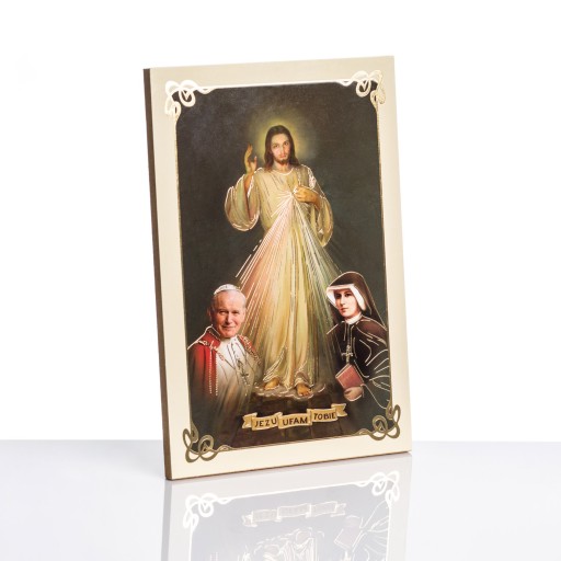 Obrazek z wizerunkiem Jezusa miłosiernego Św. Faustyny i Jana Pawła II srebrna oblamówka Obrazek wykonany jest na drewnopodobnym materiale HDF, wycinany laserem, ozdobiony termo drukiem. Obrazek do postawienia ( posiada kołeczek ) lub do powieszenia.