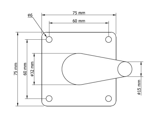 - Rozmiar blachy montażowej wynosi 75 x 75 mm o grubości 2,5 mm oraz posiada 4 otwory montażowe w rozstawie 60 mm o rozmiarze 6 mm każdy. Do montażu polecamy wkręty metryczne M6 z grupy 562 oraz mufy wkręcane z gwintem M6 lub wkręty stożkowe lub podkładkowe o średnicy 4,5 - 6,0 mm.