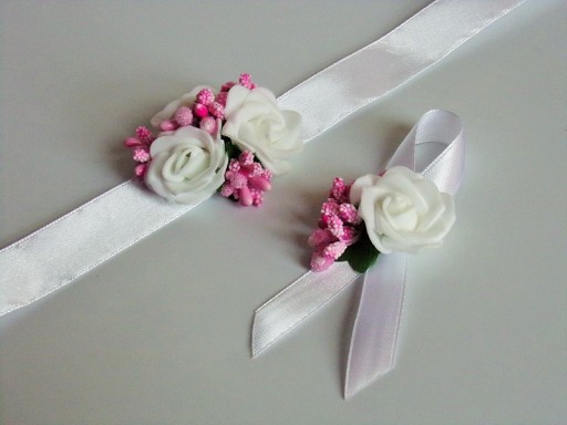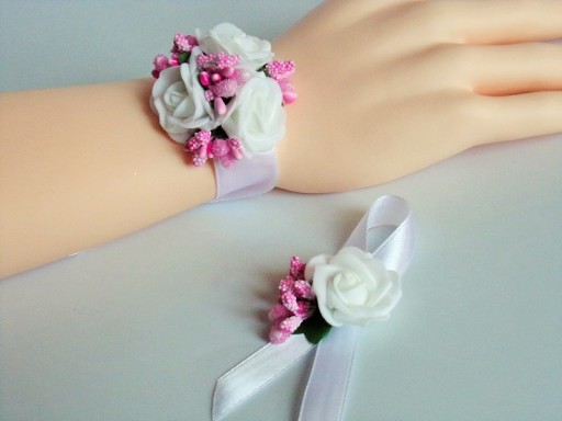 Na innej aukcji dostępne są pasujące do przypinek bukieciki na rękę dla pań.