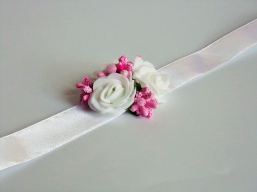 Przypinka wykonana jest z piankowej, białej różyczki, kolorowych dodatków i białej satynowej wstążki o szerokości ok. 12mm.