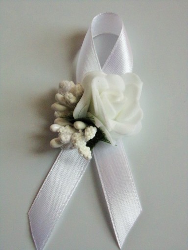 Na rękę wiązany jest za pomocą białej satynowej tasiemki o szerokości 25mm i długości ok. 40cm.