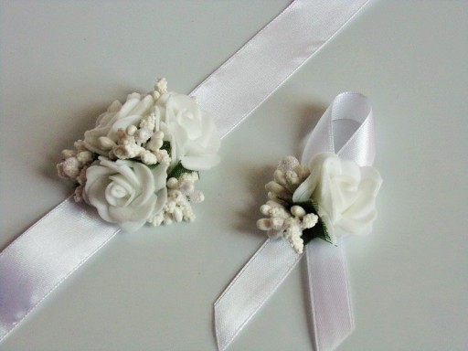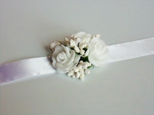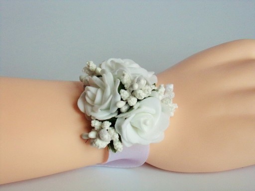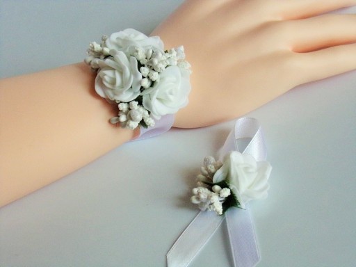 Na innej aukcji dostępne są pasujące do przypinek bukieciki na rękę dla pań.
