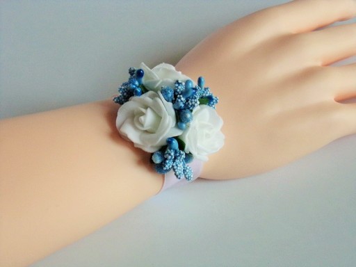 Na rękę wiązany jest za pomocą białej satynowej tasiemki o szerokości 25mm i długości ok. 40cm.