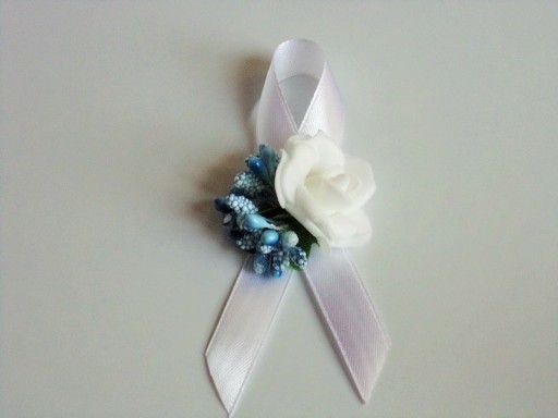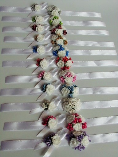 Przypinka wykonana jest z piankowej, białej różyczki, kolorowych dodatków i białej satynowej wstążki o szerokości ok. 12mm.