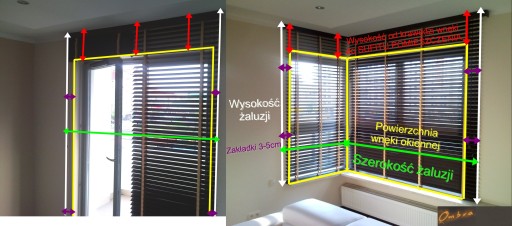 SZEROKOŚĆ ŻALUZJI – (oznaczona kolorem zielonym ) to szerokość wnęki okiennej plus zakładki po obu stronach żaluzji plus 3-5cm (kolor fioletowy) , nie ma tu specjalnej normy ma być ładnie i proporcjonalnie.