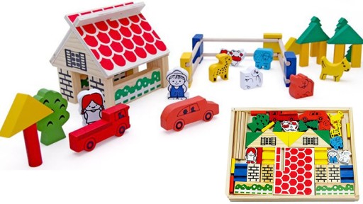 - 46 kolorowych drewnianych klocków (figurki farmera, zwierzęta i klocki do zbudowania całej zagrody)