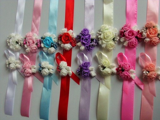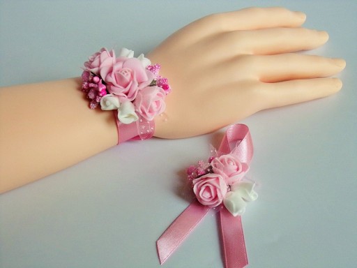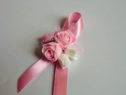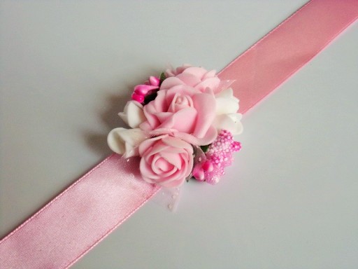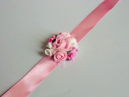 Na rękę wiązany jest za pomocą satynowej tasiemki o szerokości 25mm i długości ok. 40cm.
