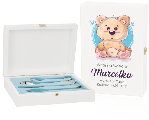 Komplet zapakowany w przepiękne drewniane pudełko z indywidualnym kolorowym nadrukiem, który spersonalizujemy zgodnie z zamówieniem!