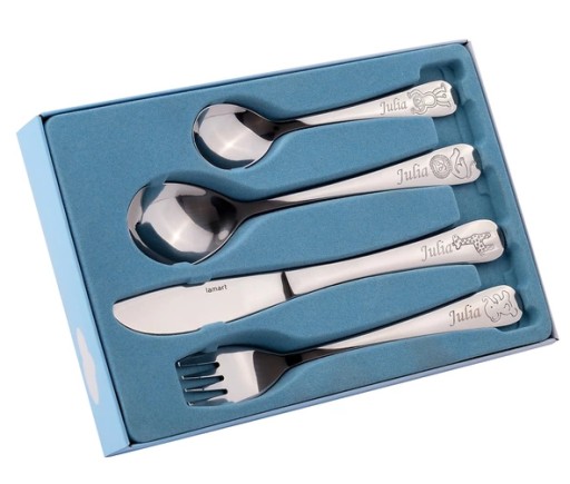 Przepiękne sztućce dla dzieci z wytłoczonym motywem ZOO. Idealny upominek z okazji Chrztu Świętego lub urodzin. Zestaw składający się z wysokiej jakości widelca, łyżki, noża oraz łyżeczki. Każdy ze sztućców ozdobiony jest zwierzątkiem, które zachęci małą pociechę do zjedzenia posiłku! Dodatkowo na każdym elemencie umieścimy wybrany przez Państwa grawer - np. imię.