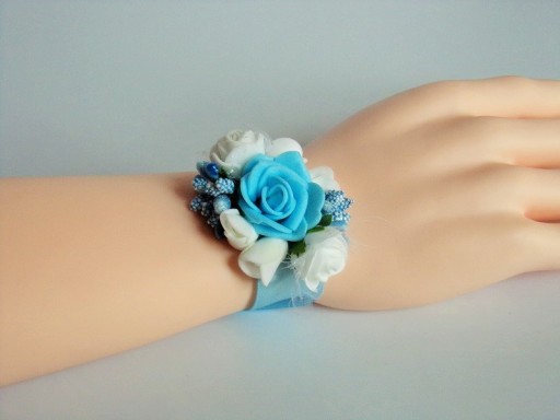 Na rękę wiązany jest za pomocą satynowej tasiemki o szerokości 25mm i długości ok. 40cm.