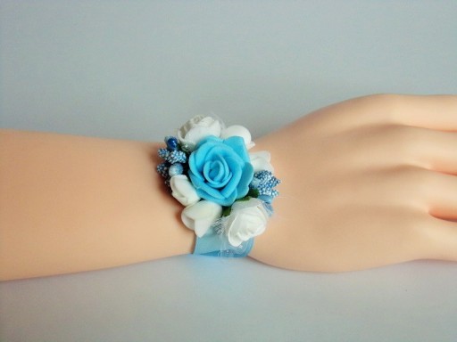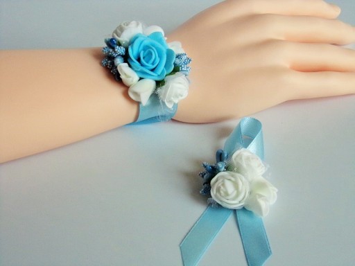 Na innej aukcji dostępne są pasujące do przypinek bukieciki na rękę dla pań.