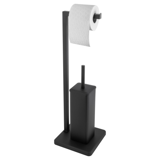 Wolnostojąca szczotka WC ze zintegrowanym uchwytem na papier toaletowy. Stojak wykonany jest z wysokiej jakości stali malowanej na czarno.