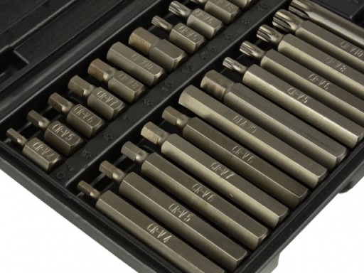 Zestaw bitów wykonany ze stali CrV, służący do odkręcania śrub specjalnych typu: torx, spline, hex. Dzięki dużej różnorodności bitów zestaw ten doskonale sprawdzi się w profesjonalnych serwisach i warsztatach samochodowych.