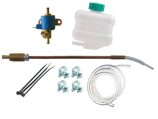 Wyraźnie niżej należy zamocować elektrozawór w miejscu możliwie suchym (lub go czymś osłonić) zwracając uwagę na kierunek przepływu oleju zaznaczony strzałką na elektrozaworze. Działanie jest proste: bez napięcia zawór jest zamknięty blokując podawanie oleju natomiast po podaniu napięcia (zwykle cyklicznie na krótką chwilę) zawór pozostanie otwarty umożliwiając grawitacyjny przepływ oleju tak długo, jak długo jest podawane napięcie 12V. Podłączając napięcie należy zwrócić uwagę na jego polaryzację : plus i minus są zaznaczone na elektrozaworze. Podawać napięcie można ręcznie (np. przycisk na kierownicy) albo automatycznie przez elektroniczny sterownik.
