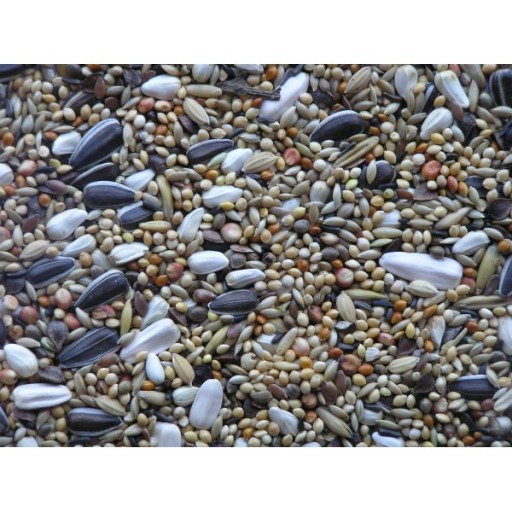 Skład: proso żółte, słonecznik, krokosz, proso białe, słonecznik paskowany, proso czerwone, gryka, konopie, murzynek, ekstra czerwone sorgo, biały słonecznik, siemię lniane, owies nagi, ryż Paddy.