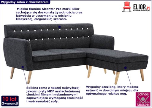Kompletując wyposażenie naszego wymarzonego salonu często stajemy przed dylematami typu czy wybrać większą, czy mniejszą sofę, narożną, klasyczną kanapę, a może fotel rozkładany? O ile takie rozważania i kalkulacje mogą przyprawić o zawrót głowy – uwolnić może od niego prezentowany model sofy narożnej z szezlongiem Larisa marki Elior! Nie sposób nie wspomnieć o walorach kolorystycznych: mamy dla Ciebie 5 różnych propozycji kolorystycznych, z których każda nadaje wnętrzu nieco inny, niepowtarzalny klimat: zieleń malachitowa, jasna delikatna szarość, elegancka ciemna szarość, nasycony modry niebieski oraz apetycznie wyglądająca brzoskwinia. Połączenie wyjątkowo trwałej tapicerki ze sprawdzonej, niezawodnej tkaniny Alcantar Pro, odpornej na zabrudzenia i łatwej w czyszczeniu oraz drewnianych, modernistycznych nóżek sprawia, że pełna szyku ciemnoszara Larisa 2D czarodziejsko zmieni Twój salon w gustowne centrum relaksu i ulubione pomieszczenie Twojej rodziny!