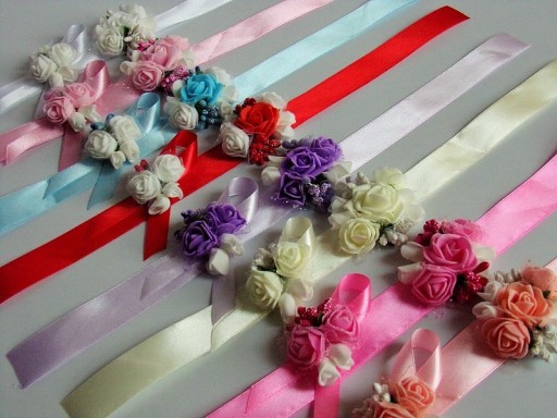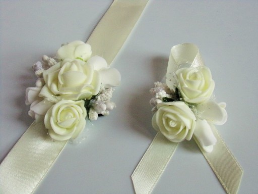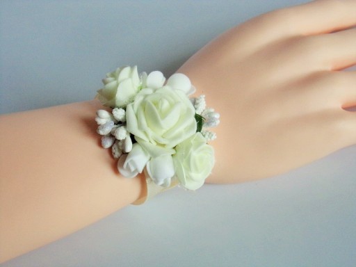 Na innej aukcji dostępne są pasujące do przypinek bukieciki na rękę dla pań.