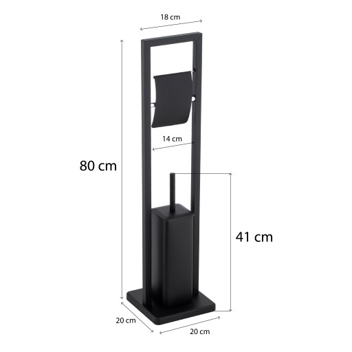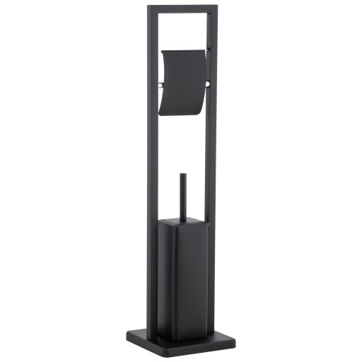 Stojak WC ze szczotką toaletową oraz uchwytem na papier toaletowy z klapką. Wykonany z wysokiej jakości stali malowanej proszkowo na kolor czarny. Szczotka wc posiada plastikowy pojemnik chroniący przed rdzewieniem i ułatwiający czyszczenie. Antypoślizgowa podstawa zapewnia stojakowi dużą stabilność.