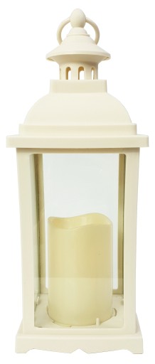 Latarnia Led, wykonana z tworzywa sztucznego. Posiada 4 szklane szybki.