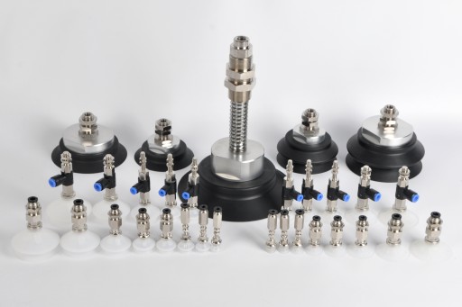 - nazwa: podciśnieniowa przyssawka / ssawka próżniowa, mieszkowa z ożebrowaniem, z uchwytem mocującym i wtykowym szybkozłączem pneumatycznym,