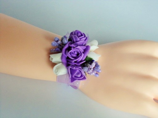 Na innej aukcji dostępne są pasujące do przypinek bukieciki na rękę dla pań.