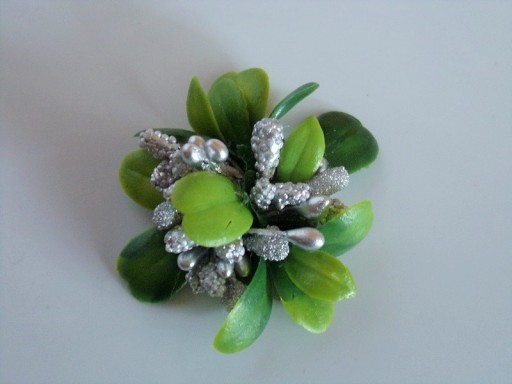 Przypinka wykonana jest z kolorowych dodatków florystycznych i zielonych listków.