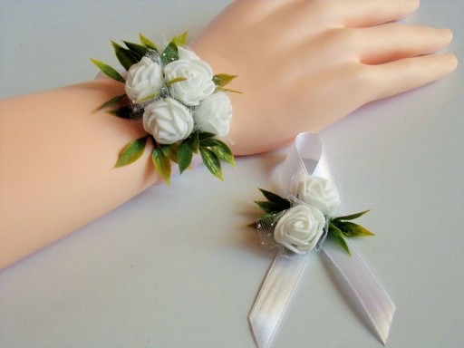Na rękę wiązany jest za pomocą białej satynowej tasiemki o szerokości 25mm i długości ok. 40cm.
