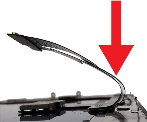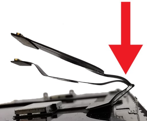 Podczas montażu wyświetlacza proszę zwrócić szczególną uwagę na ułożenie taśm połączeniowych. Niewłaściwe ułożenie ich w korpusie będzie skutkowało złamaniem taśm a co za tym idzie nieprawidłowościami w działaniu ekranu. Poniżej zdjęcie: