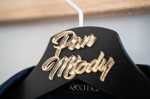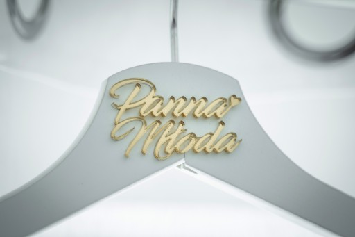 Niepowtarzalnego charakteru dodadzą starannie wykonane błyszczące lustrzane napisy "Pani Młoda" oraz "Pan Młody" umieszczone w centralnym punkcie wieszaka.
