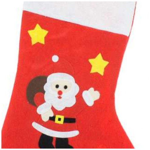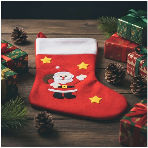 Model wyróżnia się eleganckim wykonaniem - postać Mikołaja oraz dekoracyjne gwiazdki są starannie naszywane, co nadaje skarpecie wyjątkowego charakteru i sprawia, że wygląda znacznie bardziej prestiżowo niż klasyczne, drukowane wersje. Każdy element został wykonany z dbałością o detale, dzięki czemu skarpeta pięknie prezentuje się zarówno z bliska, jak i zawieszona jako część świątecznej aranżacji.
