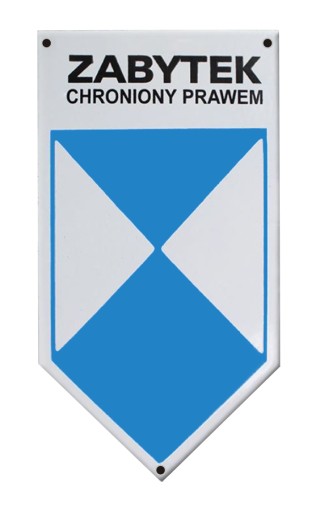 Art. 12. 1. USTAWY z dnia 23 lipca 2003 r. o ochronie zabytków i opiece nad zabytkami stanowi że, starosta, w uzgodnieniu z wojewódzkim konserwatorem zabytków, może umieszczać na zabytku nieruchomym wpisanym do rejestru znak informujący o tym, iż zabytek ten podlega ochronie. W ustawie postanowiono, że Minister właściwy do spraw kultury i ochrony dziedzictwa narodowego określi, w drodze rozporządzenia, wzór i wymiary znaku, o którym mowa. Rozporządzenie powinno określić formę graficzną znaku, wyróżniającą się wśród innych znaków, z uwzględnieniem dotychczas używanego wzoru, a także pisemną informację, że dany obiekt jest zabytkiem i podlega ochronie. Oznakowanie określono szczegółowo w ROZPORZĄDZENIU MINISTRA KULTURY z dnia 9 lutego 2004 r. w sprawie wzoru znaku informacyjnego umieszczanego na zabytkach nieruchomych wpisanych do rejestru zabytków.