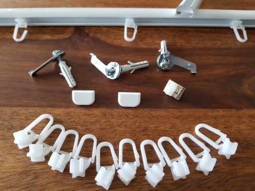 Aukcja dotyczy sprzedaży 10cm szyny razem z akcesoriami do montażu i zawieszenia firan lub zasłon